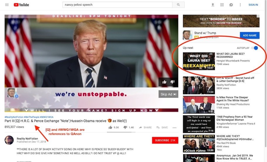 For example, here’s the list of consecutively recommended videos on one January 7 query for “nancy pelosi speech” that goes from a BBC News clip to a series of QAnon conspiracy videos after 10 jumps: