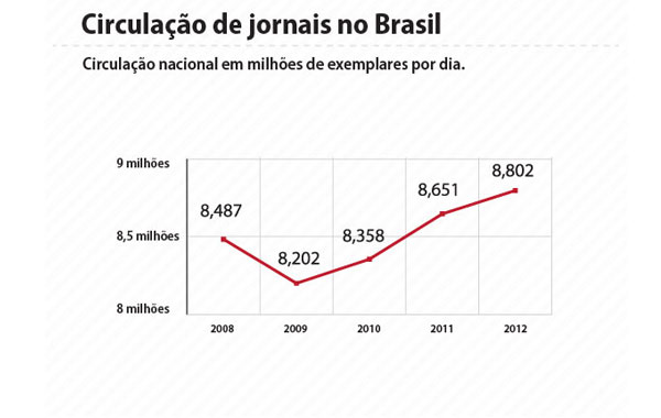 Em seu site, a Associação Nacional dos Jornais (ANJ) também se apresenta otimista: “Publicidade em jornais brasileiros deve aumentar 5% em 2013”, anuncia. “Apesar do pequeno crescimento do PIB em 2012, os investimentos em publicidade em jornal no Brasil devem aumentar 5%, conforme as previsões da Warc, um centro de pesquisa voltado ao levantamento das tendências do mercado publicitário mundial”. Usando outra fonte, a pesquisa Inter-Meios, uma iniciativa do jornal Meio & Mensagem com “os principais meios de comunicação do Brasil”, a ANJ mostra por A mais B que os anúncios em jornais têm aumentado ano a ano – foram de R$ 3,36 bilhões em 2011 para R$ 3,38 bilhões em 2012.